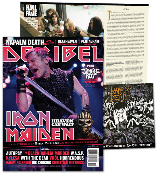 Two legendary bands from opposite ends of the extreme music spectrum make November’s Decibel a must-read: Iron Maiden gallops onto their fourth dB cover, and Napalm Death grinds out their second Hall of Fame.