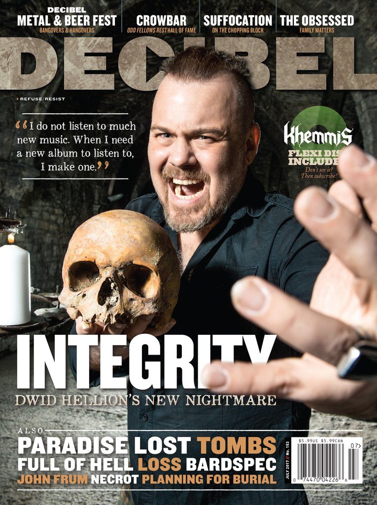 Integrity frontman Dwid Hellion has continued to bring new ideas to his songs, keeping the band’s music fresh while many other artists continue to repeat ad infinitum. A focus of the cover story is a variety of influences–Hellion states “I think we are all rather complex creatures with a great deal of diversity, hypocrisy, delusion, and hope.” Similarly, this month’s Decibel Meter contains a wide spread of the extreme metal spectrum, from death to doom to thrash and numerous spots between.