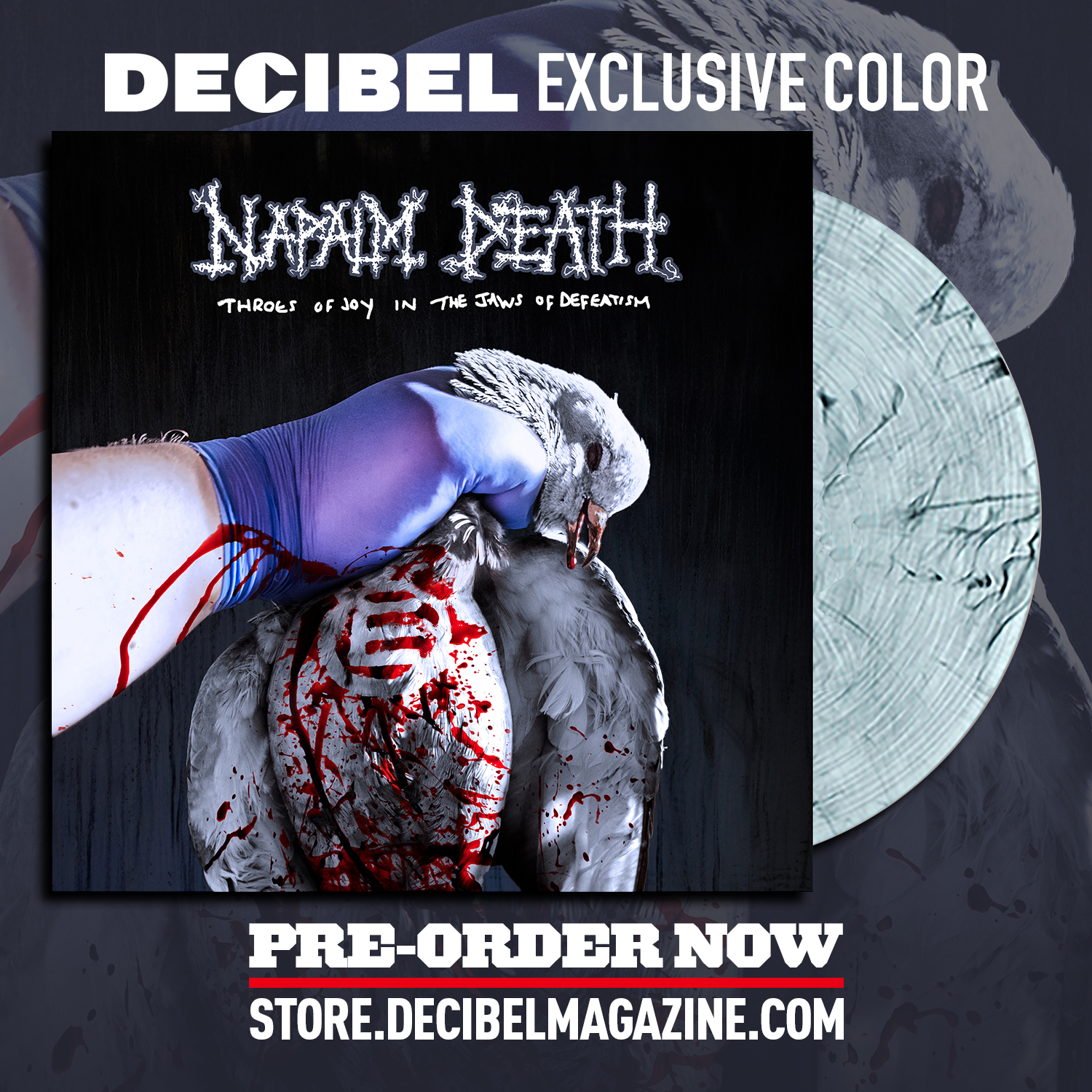 Napalm Death’s first new studio LP in over five years is now available for pre-order, and Decibel brings you this exclusive de-weaponised steel and black swirled vinyl color! Throes of Joy in the Jaws of Defeatism is available to Decibel readers in a 180-g custom color hand-chosen by the band with a two-page insert and A2 poster. This color is limited to 200 copies worldwide, so don’t succumb to defeat: pre-order your copy right now!