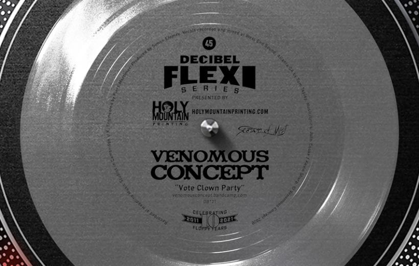 A full decade ago, the Decibel Flexi Series launched featuring two exclusive tracks from grind legends and dB favorite Brutal Truth. Though the series has outlived our brethren of blast, our latest entry features the next best thing. Venomous Concept, the oddball grinders featuring Brutal Truth’s Kevin Sharp as well as Napalm Death’s Shane Embury, Danny Herrera and John Cooke, have written a timely song as strange as the days we are living in. Aptly titled “Vote Clown Party,” this necessary addition to any respectable vinyl collection sees the return to clear plastic in homage to the very first track that started our legacy of pain. If you want to join in on celebrating ten years of delivering the latest in all things exclusive and extreme, be sure to sign up for a deluxe Decibel subscription by Monday, November 2 at 12pm EST. Cheers to everyone who has supported us over these past 10 years and here’s to decades more!